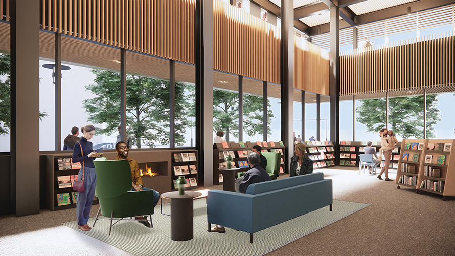 Relax and recharge in the Fireside Commons, offering cozy fireside seating for readers and small groups.